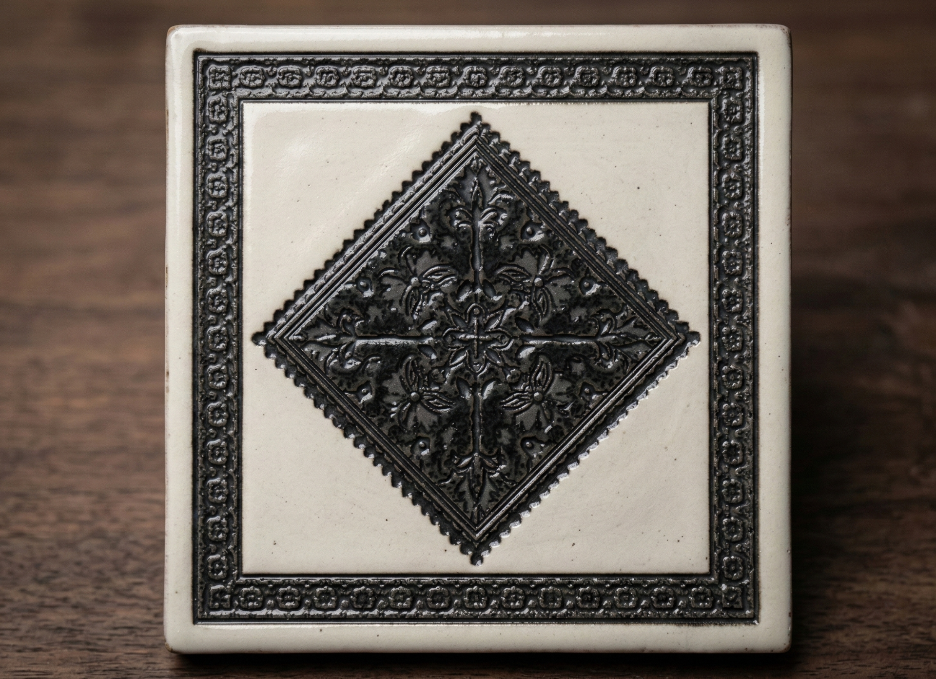 Il design presenta una base chiara dall'aspetto volutamente materico, impreziosita da un elaborato motivo a rombo centrale e da una rigida cornice scura a contrasto. I complessi intarsi dal sapore vintage creano un elegante gioco di profondità, donando carattere e tridimensionalità a qualsiasi superficie. Celebrando la "perfetta imperfezione" della lavorazione artigianale, è la scelta ideale per ambienti dal sapore autentico che vogliono raccontare una storia.