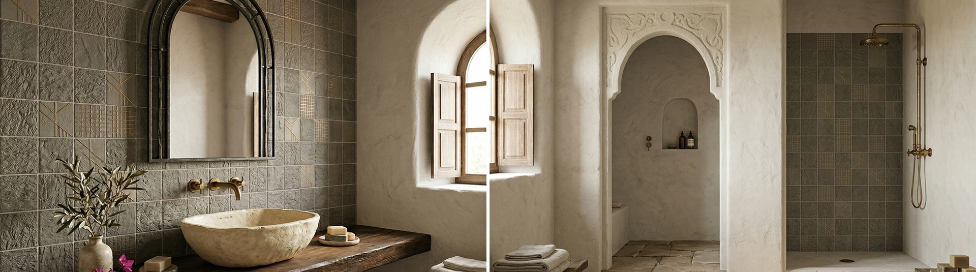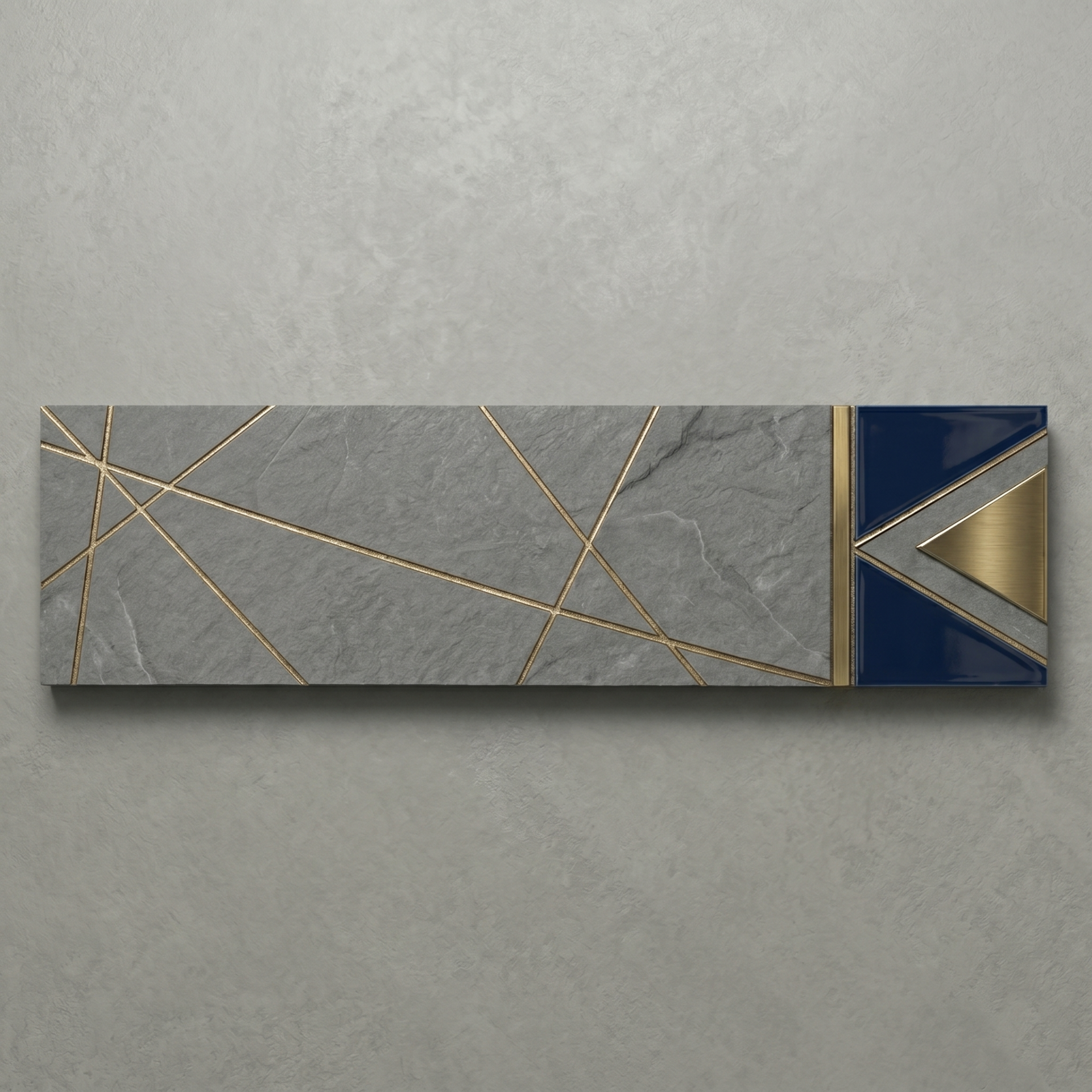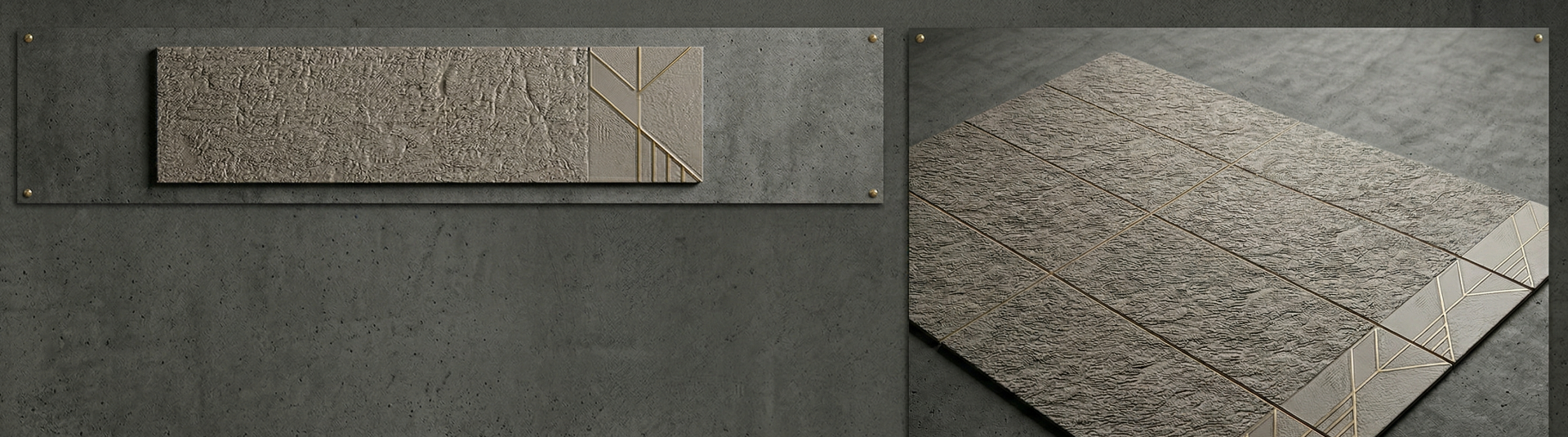 Il design si distingue per il dualismo affascinante dei suoi elementi: la ruvidezza tattile e irregolare, che ricorda la nuda pietra naturale, incontra la precisione millimetrica di linee geometriche luminose dai riflessi dorati. Questo formato allungato crea un vibrante gioco di luci e ombre, esaltando la matericità del grigio e arricchendolo con un tocco di luce preziosa e geometrica. È la scelta perfetta per chi desidera ambienti dal fascino scultoreo, capaci di unire l'energia della materia grezza a una raffinatezza assoluta.