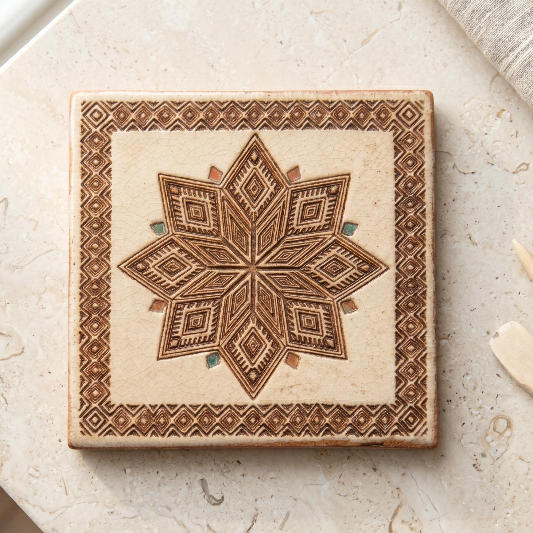 Design: Geometria complessa a stella e motivi ispirati agli antichi mosaici.