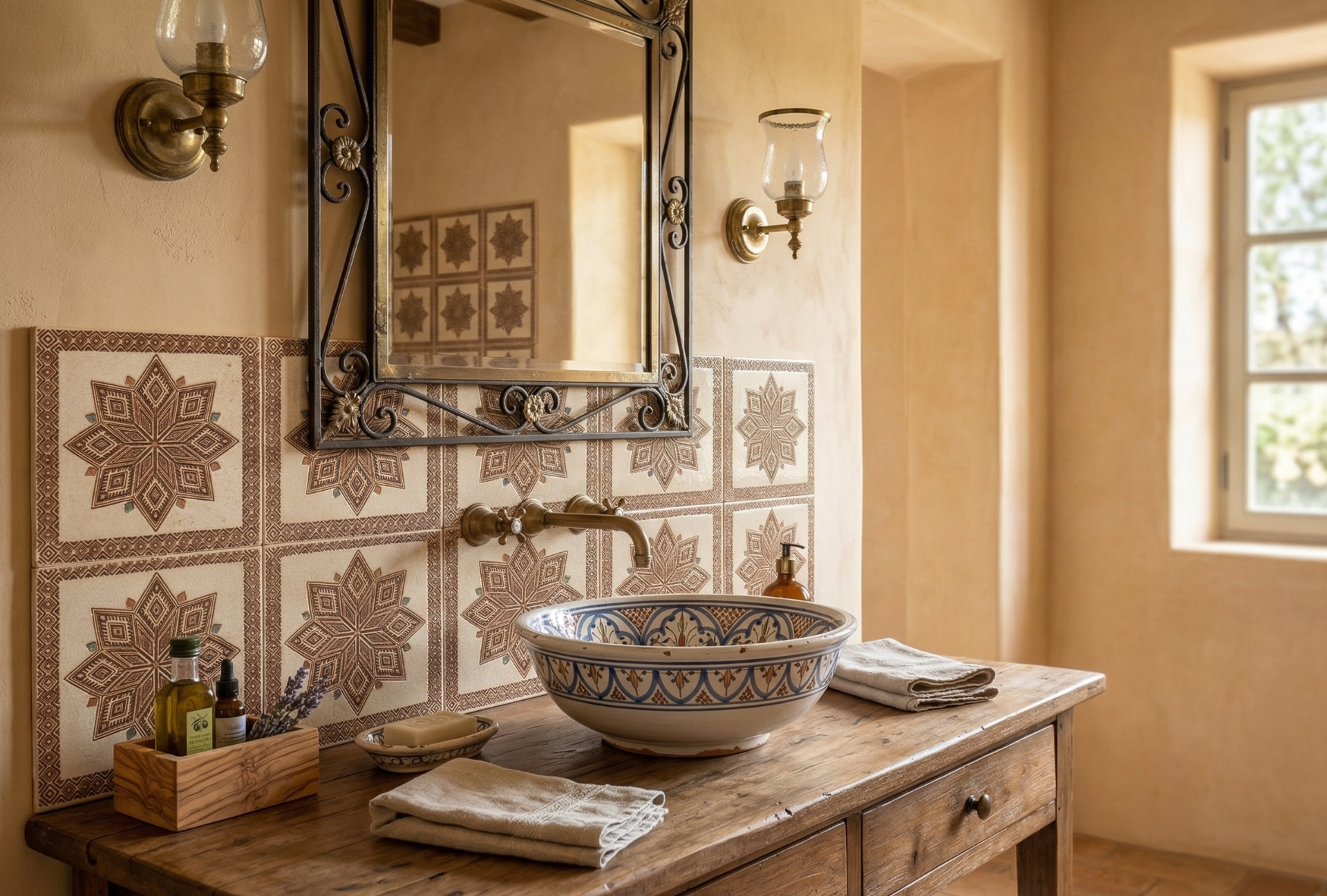 Il design è caratterizzato da una complessa geometria a stella centrale, ispirata agli antichi decori, circondata da una raffinata cornice di motivi intrecciati. Le calde tonalità del marrone e della terra bruciata spiccano con eleganza sul fondo materico chiaro, arricchite da piccoli e preziosi accenti colorati che donano luce e vivacità al pattern. È la scelta perfetta per creare ambienti che fondono il gusto rustico con un'eleganza senza tempo.