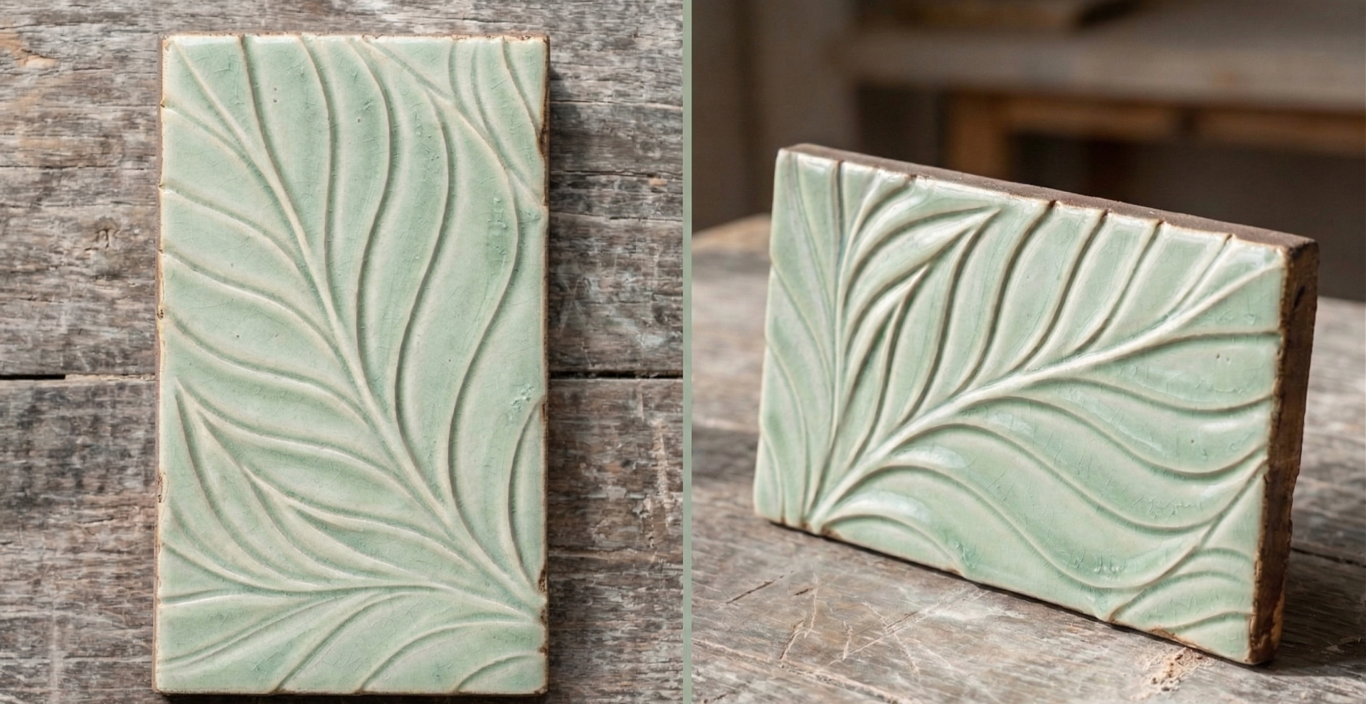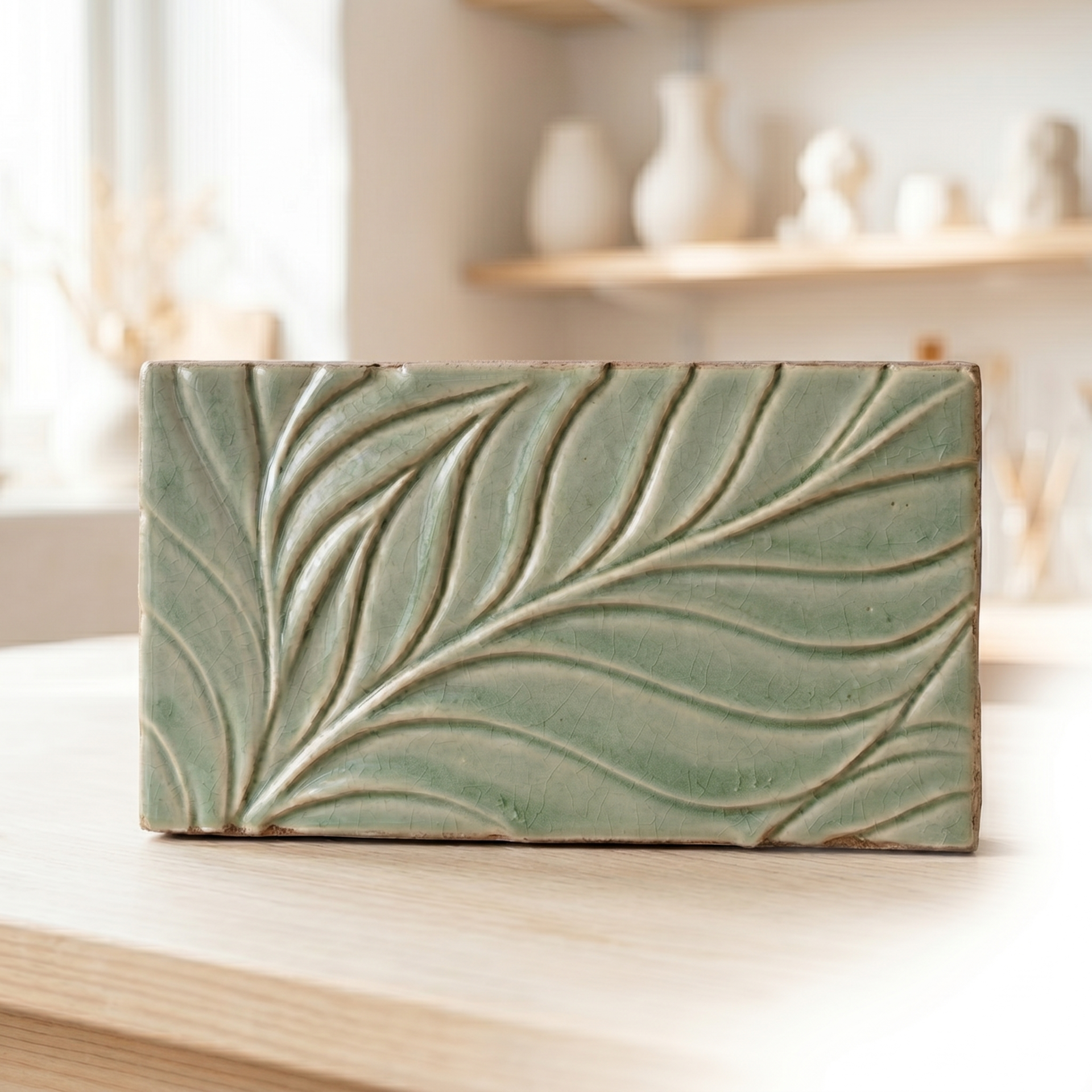 Il design si distingue per un sinuoso motivo a foglia impresso a rilievo nell'argilla, che riproduce con eleganza i movimenti organici delle venature naturali. Le tenui e rilassanti sfumature di verde salvia, arricchite da una lucente finitura smaltata dai contorni volutamente irregolari, catturano la luce e infondono un profondo senso di pace. È la scelta ideale per chi cerca un'estetica autentica, in perfetto equilibrio tra maestria artigianale e design botanico.
