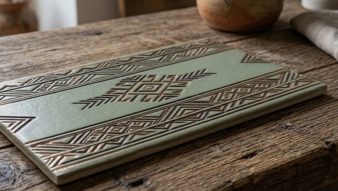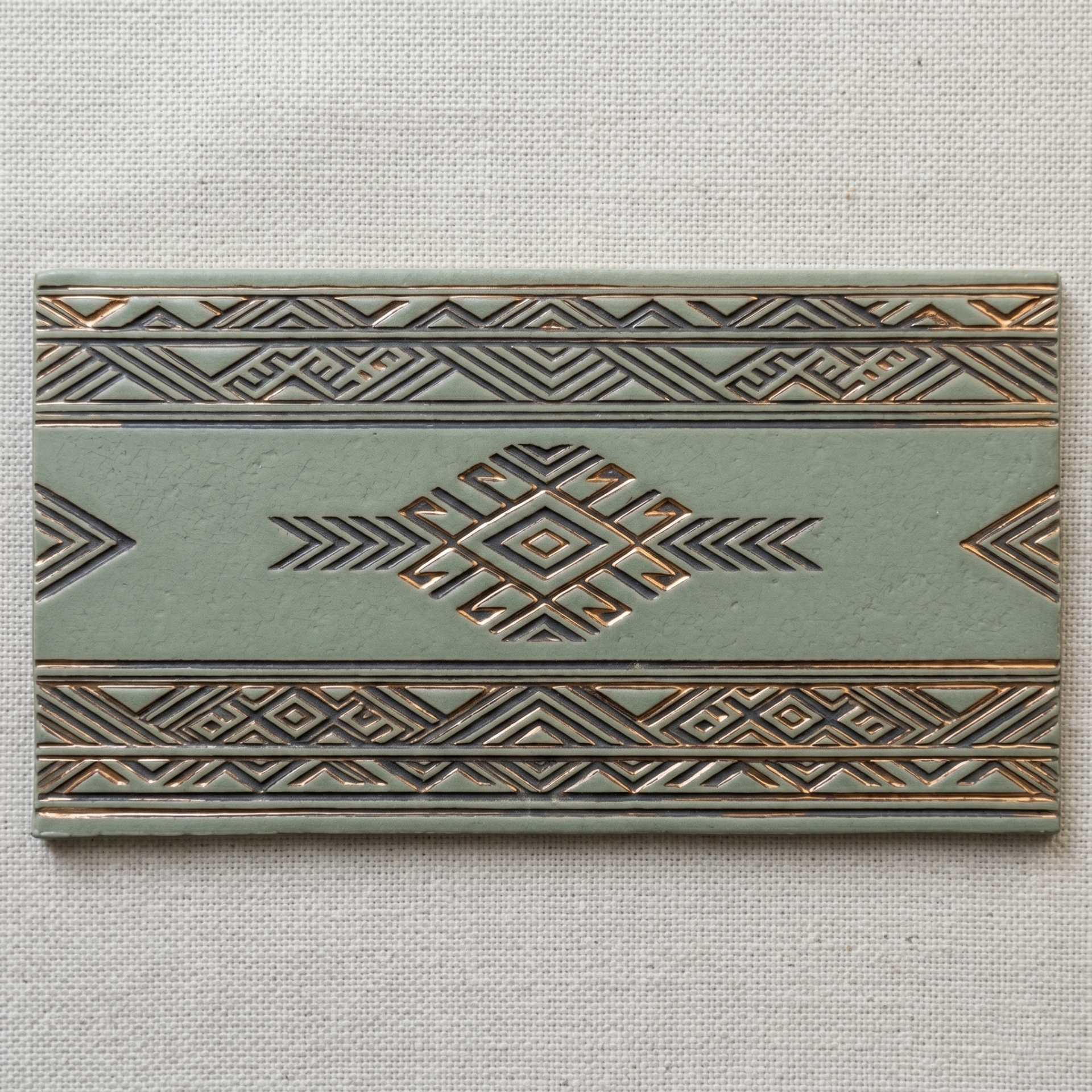 Il design si distingue per complessi motivi geometrici incisi che ricordano le lavorazioni degli antichi telai. Sul delicato fondo materico verde salvia spiccano eleganti dettagli a contrasto nei toni del rame e del bronzo, creando una texture profondamente tattile e tridimensionale. È la scelta perfetta per chi desidera conferire agli ambienti un carattere etnico-chic, fondendo la naturalità dell'argilla con un'estetica ricercata.